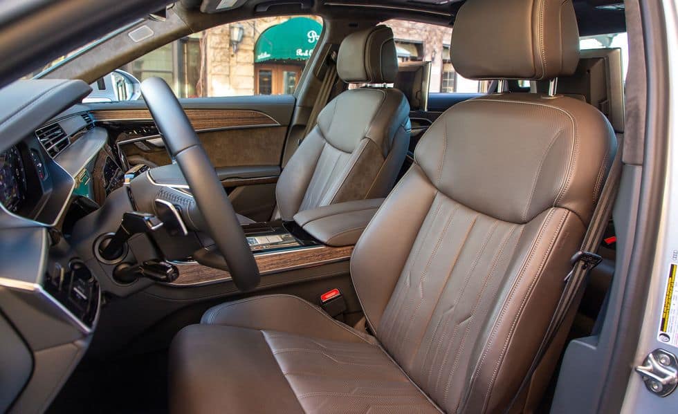 تبلغ مساحة الصف الأمامي 38.3 بوصة في A8 مقارنة بـ 39.9 بوصة في الفئة السابعة من BMW و تبلغ مساحة الرأس للصف الثاني 38.5 بوصة في A8، أي أقل قليلاً من 38.9 بوصة في الفئة السابعة.
